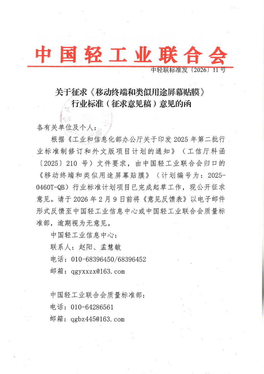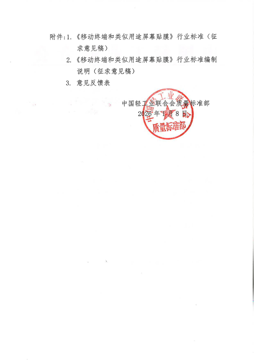 关于征求《移动终端和类似用途屏幕贴膜》 行业标准(征求意见稿)意见的函
