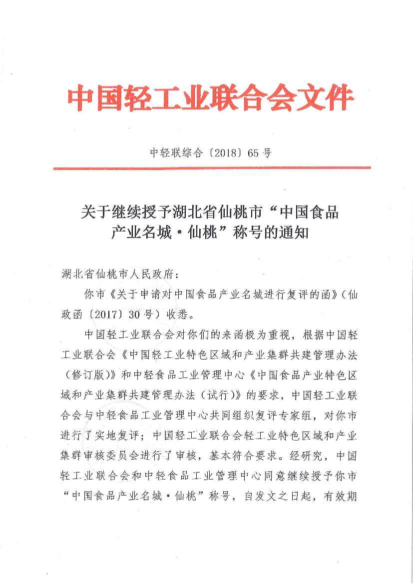 关于继续授予湖北省仙桃市“中国食品产业名城•仙桃”称号的通知
