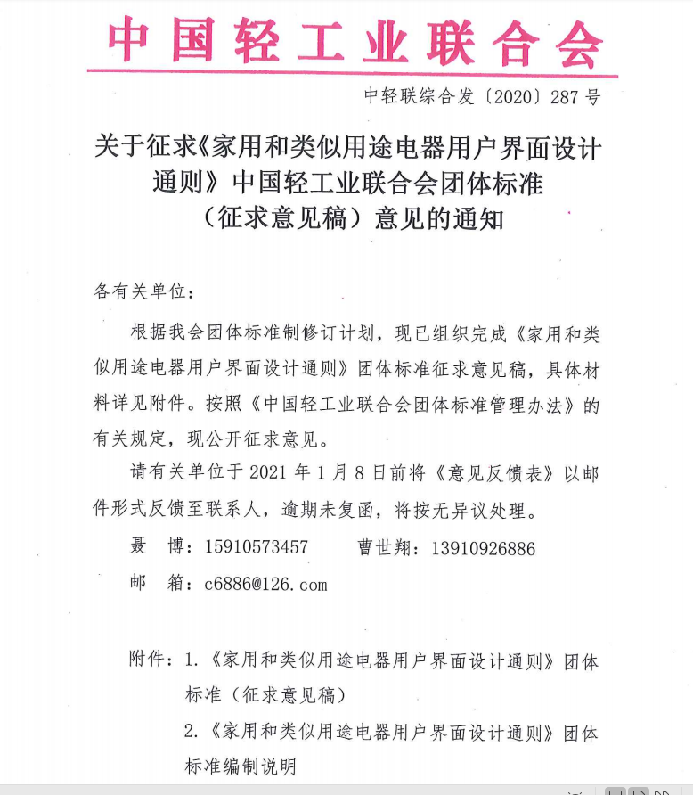 关于征求《家用和类似用途电器用户界面设计 通则》中国轻工业联合会团体标准 (征求意见稿)意见的通知
