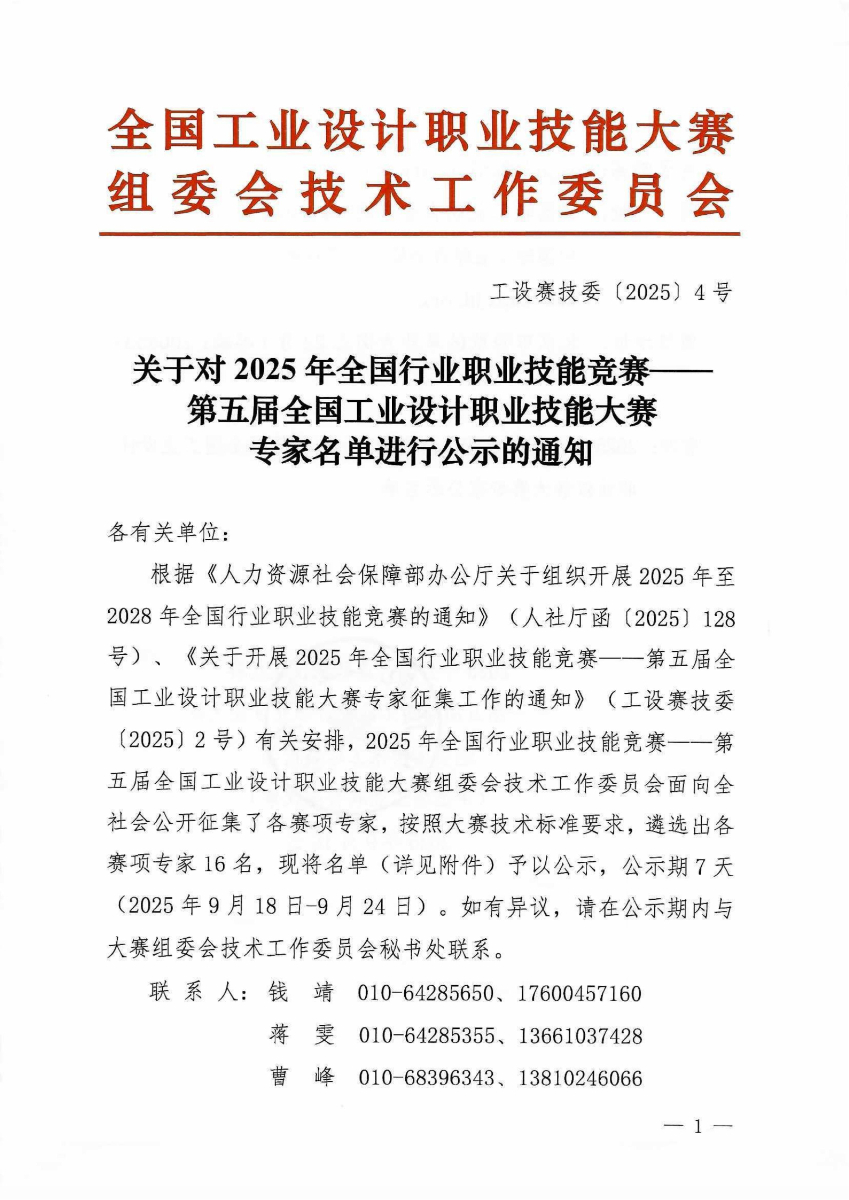 关于对2025年第五届全国工业设计职业技能大赛专家名单进行公示的通知
