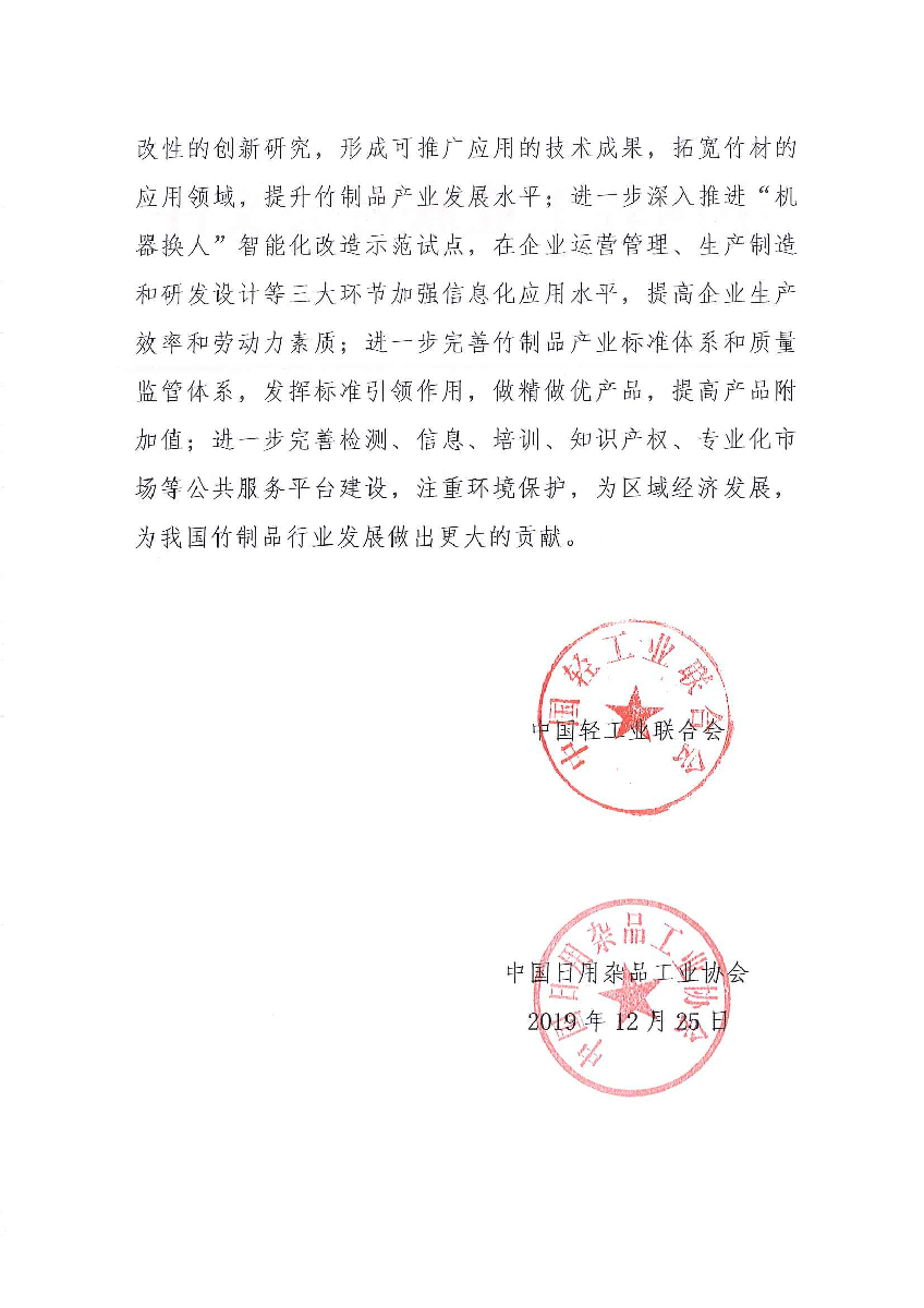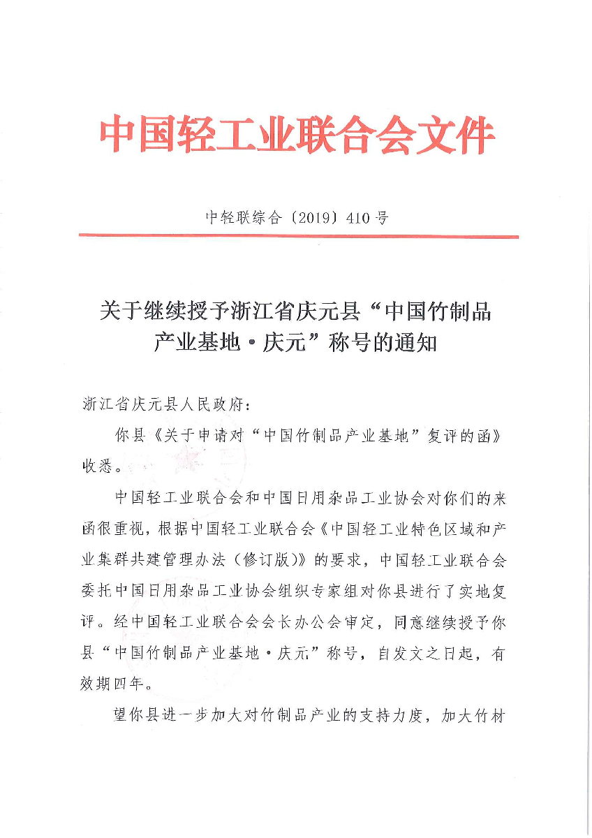 关于继续授予浙江省庆元县“中国竹制品产业基地·庆元”称号的通知