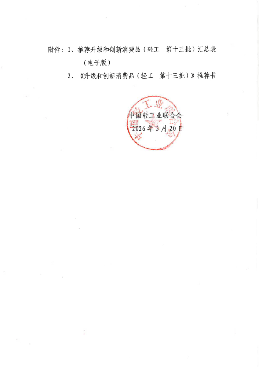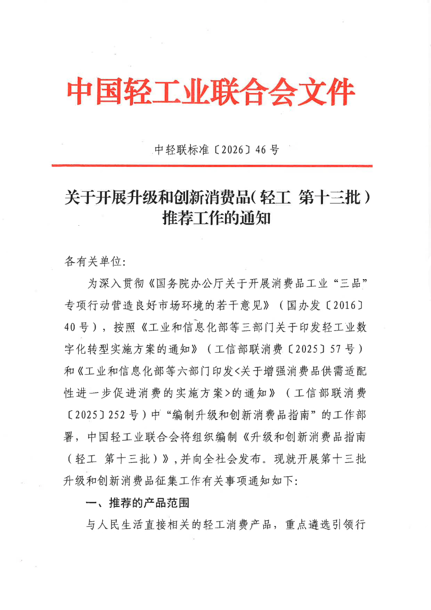 关于开展升级和创新消费品(轻工 第十三批)推荐工作的通知(中轻联标准(2026)46号).pdf